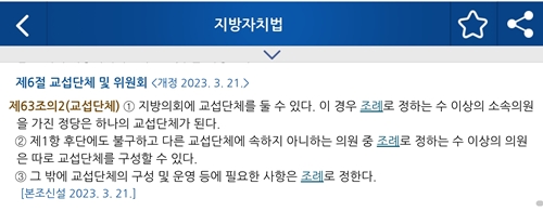 ÇÑÆí, 2023³â 3¿ù °³Á¤µÈ Áö¹æÀÚÄ¡¹ý Á¦63Á¶ÀÇ2´Â ±³¼·´Üü ¼³Ä¡¸¦ ¹ýÀûÀ¸·Î ¸í¹®ÈÇßÁö¸¸, ±âÃÊÀÇȸ »ó´ç¼ö´Â °ü·Ã Á¶·ÊÁ¶Â÷ Á¦Á¤ÇÏÁö ¾Ê¾Æ ¹ý°ú Çö½ÇÀÇ ±«¸®°¡ Áö¼ÓµÇ°í ÀÖ´Ù.