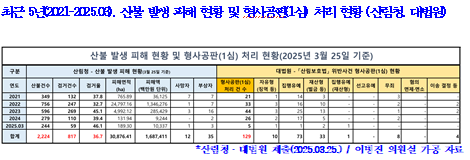 ½ÇÁ¦·Î, À̺´Áø ÀÇ¿øÀÌ »ê¸²Ã»À¸·ÎºÎÅÍ Á¦Ãâ¹ÞÀº ÀÚ·á¿¡ µû¸£¸é, ÃÖ±Ù 5³â°£(2021-2025.03) ¹ß»ýÇÑ »êºÒ 2,224°Ç Áß ¹æÈ¹ü °Ë°Å´Â ´Ü 817°ÇÀ¸·Î, °Ë°ÅÀ²ÀÌ 36.7%¿¡ ºÒ°úÇÑ °ÍÀ¸·Î ³ªÅ¸³µ´Ù.