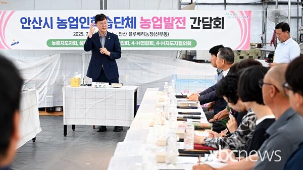 °£´ãȸ´Â ¾È»ê½ÃÀÇ ÁÖ¿ä ³óÁ¤ ¹æÇâ°ú ³ó¾÷±â¼ú¼¾ÅÍÀÇ ÁßÁ¡ »ç¾÷¿¡ ´ëÇÑ ¼³¸í°ú ÇÔ²² ÁúÀÇ ÀÀ´äÇÏ´Â ½Ã°£À¸·Î ÁøÇàµÆ´Ù. ÇöÀå¿¡¼´Â ¡ãû³â ³ó¾÷ÀÎ Áö¿ø ¡ã³óÃÌÀη³ ÇØ¼Ò¸¦ À§ÇÑ ¿µ³ó´ëÇà ÀÛ¾÷´Ü Áö¿ø ¡ã·ÎÄÃǪµå ÆÇ·Î È®´ë µî ´Ù¾çÇÑ °ÇÀǰ¡ ½ñ¾ÆÁ³´Ù.