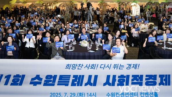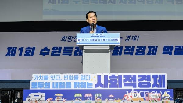 29ÀÏ ¼ö¿øÄÁº¥¼Ç¼¾ÅÍ ÄÁº¥¼ÇȦ¿¡¼ ¿¸° ¡®Á¦1ȸ ¼ö¿øÆ¯·Ê½Ã »çȸÀû°æÁ¦ ¹Ú¶÷ȸ¡¯ °³¸·Çà»ç¿¡ ÇÔ²²ÇÑ ÀÌÀçÁØ ½ÃÀåÀº ¡°»çȸÀû °æÁ¦´Â »ç¶÷À» Á߽ɿ¡ µÎ´Â ¿¬´ë¿Í Çù·Â, °øÁ¸ÀÇ °æÁ¦¡±¶ó¸ç ¡°¿ì¸® »çȸ °÷°÷ÀÌ µû¶æÇÑ Áö¿ª°æÁ¦·Î ¹°µé ¼ö ÀÖµµ·Ï, »çȸÀû°æÁ¦ÀÇ ¼ºÀå ±â¹ÝÀ» ¸¶·ÃÇÏ´Â µ¥ ÈûÀ» ½ñ°Ú´Ù¡±°í ¹àÇû´Ù.