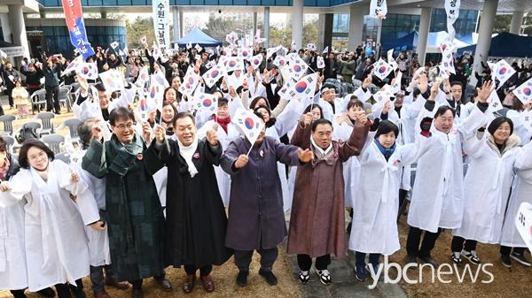 ¼ö¿ø½Ã¸¦ ´ëÇ¥ÇØ ÀÌÀçÁØ ¼ö¿ø½ÃÀå°ú ¼ö¿ø½ÃÀÇȸ, Áö¿ª ±¹È¸ÀÇ¿ø°ú º¸ÈÆ´ÜüÀå µîÀº µ¶¸³À» À§ÇØ Çå½ÅÇÏ°í ¼ø±¹ÇÑ ¼±¿µéÀÇ ¼þ°íÇÑ ¶æÀ» ±â¸®°íÀÚ °¨»çÀÇ ¸¶À½À» ´ãÀº ÇåÈ¿Í ºÐÇâÀ» ÇÏ¸ç ±¤º¹ÀýÀ» ¿¬´Ù.