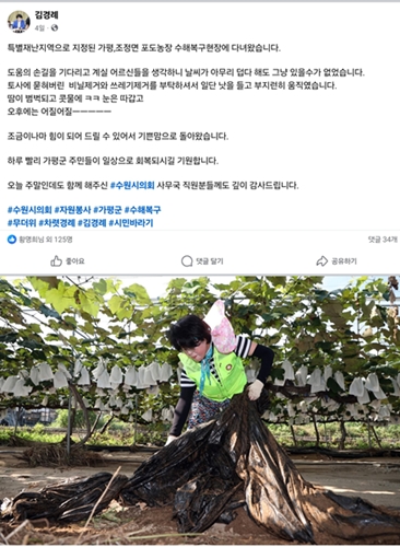 ¼ö¿øÆ¯·Ê½ÃÀÇȸ ±è°æ·Ê ÀÇ¿øÀÌ Áö³­´Þ 27ÀÏ °¡Æò±º ¼öÇØ º¹±¸¸¦ ´Ù³à¿Â µÚ ÀÚ½ÅÀÇ SNS ÆäÀ̽ººÏ¿¡ ¿Ã¸° ±Û°ú »çÁø/»çÁø=±è°æ·Ê ÀÇ¿ø ÆäÀ̽ººÏ