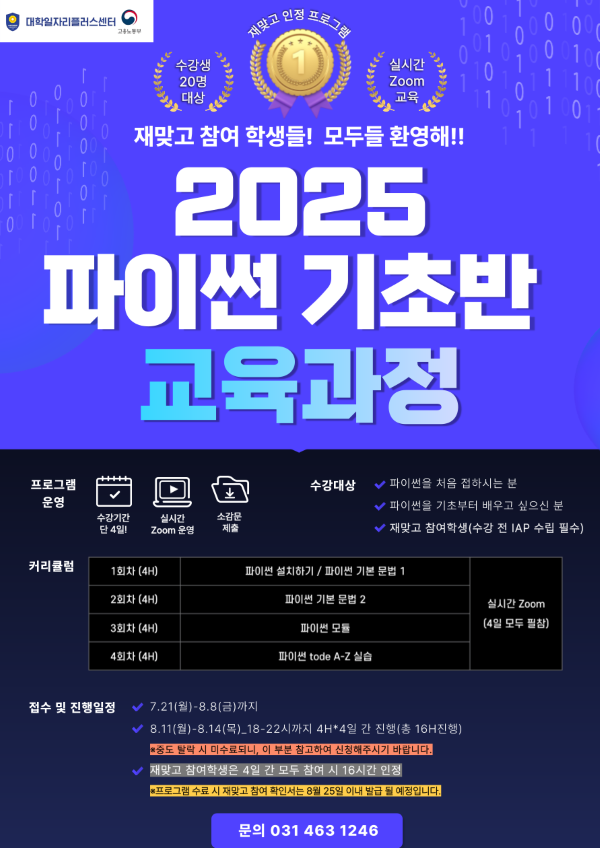 ¾È¾ç´ëÇб³(ÃÑÀå À層¼ö) ´ëÇÐÀÏÀÚ¸®Ç÷¯½º¼¾ÅÍ´Â IT Á÷¹«·Î Ãë¾÷À» Èñ¸ÁÇÏ´Â ÇлýµéÀ» ´ë»óÀ¸·Î ¡®2025³â ÆÄÀ̽㠱âÃÊ¹Ý ±³À°°úÁ¤ Ư° ÇÁ·Î±×·¥¡¯À» ¿î¿µÇÑ´Ù.