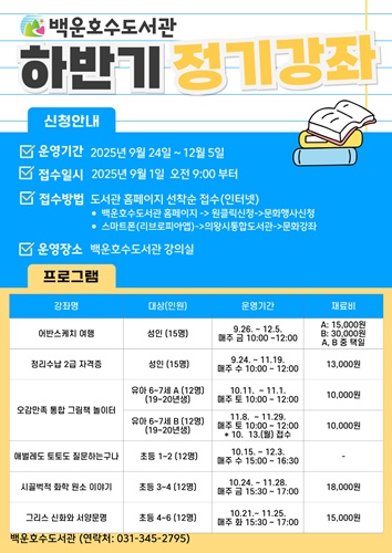 ÇÁ·Î±×·¥ÀÇ ½ÅûÀº 9¿ù 1ÀϺÎÅÍ ¹é¿îÈ£¼öµµ¼­°ü ȨÆäÀÌÁö(www.uwlib.or.kr/baegun)¿¡¼­ ¼±Âø¼øÀ¸·Î ÁøÇàµÇ¸ç, °¢ °­ÁÂÀÇ ÀÏÁ¤, Àç·áºñ µîÀÇ ±âŸ ÀÚ¼¼ÇÑ »çÇ×Àº ȨÆäÀÌÁö °øÁö»çÇ×¶õÀ» È®ÀÎÇϰųª Àǿսà ¹é¿îÈ£¼öµµ¼­°ü(345-2795)À¸·Î ¹®ÀÇÇÏ¸é ¾È³»¹ÞÀ» ¼ö ÀÖ´Ù.