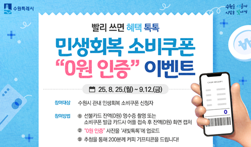 ¼ö¿ø½Ã(½ÃÀå ÀÌÀçÁØ)°¡ ¹Î»ýȸº¹ ¼ÒºñÄíÆù »ç¿ëÀ» µ¶·ÁÇϱâ À§ÇØ 8¿ù 25ÀϺÎÅÍ 9¿ù 12ÀϱîÁö ¡®0¿ø ÀÎÁõ À̺¥Æ®¡¯¸¦ ¿¬´Ù.