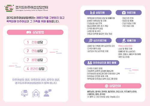 ÀÌÁÖ¿©¼ºÀº ÆòÀÏ ¿ÀÀü 9½ÃºÎÅÍ ¿ÀÈÄ 6½Ã±îÁö ÀüÈ(031-429-7919) ¶Ç´Â ¹æ¹®À» ÅëÇØ »ó´ãÀ» ¹ÞÀ» ¼ö ÀÖÀ¸¸ç, Å롤¹ø¿ª ¼ºñ½º¿Í ´Ù´©¸®Äݼ¾ÅÍ(1577-1366, 365ÀÏ 24½Ã°£) ¿¬°è·Î ¾ð¾î À庮 ¾øÀÌ Á¢±ÙÇÒ ¼ö ÀÖ´Ù. °ü·Ã ÀÚ¼¼ÇÑ Á¤º¸´Â °æ±âµµÀÌÁÖ¿©¼º»ó´ã¼¾ÅÍ ´©¸®Áý(ggmw.or.kr) ¶Ç´Â °æ±âµµ ´©¸®Áý(gg.go.kr)¿¡¼ È®ÀÎÇÒ ¼ö ÀÖ´Ù.