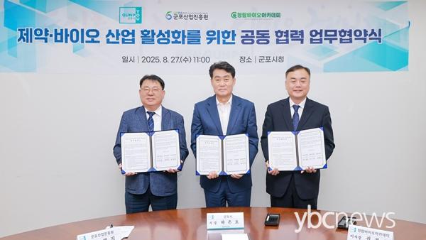 ±ºÆ÷½Ã(½ÃÀå ÇÏÀºÈ£)´Â 8¿ù 27ÀÏ ½Ãû ȸÀǽǿ¡¼­ ±ºÆ÷»ê¾÷ÁøÈï¿ø, û¶÷¹ÙÀÌ¿À¾ÆÄ«µ¥¹Ì¿Í Á¦¾à¡¤¹ÙÀÌ¿À¡¤ÇコÄÉ¾î »ê¾÷ Ȱ¼ºÈ­ ¹× Áö¿ª ÀÎÀç ¾ç¼ºÀ» À§ÇÑ 3ÀÚ ¾÷¹«Çù¾àÀ» ü°áÇß´Ù.