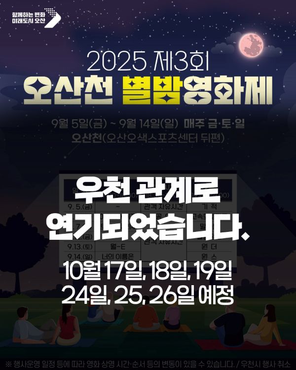¿À»ê½Ã(½ÃÀå À̱ÇÀç)´Â ¿À´Â 9¿ù 5ÀϺÎÅÍ 14ÀϱîÁö ¿¹Á¤µÈ ¡®2025 Á¦3ȸ ¿À»êõ º°¹ã¿µÈ­Á¦¡¯¸¦ Çà»ç ±â°£ Áß ºñ ¿¹º¸·Î ºÎµæÀÌÇÏ°Ô 10¿ù·Î ¿¬±âÇϱâ·Î °áÁ¤Çß´Ù.