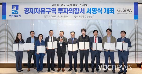 ¼ö¿ø½Ã´Â 24ÀÏ ¼ö¿øÄÁº¥¼Ç¼¾ÅÍ VIP ´ÙÀÌ´×·ë¿¡¼ ¡®°æÁ¦ÀÚÀ¯±¸¿ª ÅõÀÚÀÇÇâ¼ ¼¸í½Ä¡¯À» ¿¾ú´Ù. ¹ÙÀÌ¿À¿¡ÇÁµð¿£¾¾, ¿¥ÇÇ¿À½º, Çѱ¹¹ÙÀÌ¿À¼¿ÇÁ, ¾Æ¹ÙŸÅ×¶óǻƽ½º, ¾Æ¹ÝÆ®¸¯½º, ¿À°¡³ëÇ÷¯½º, ¸Þµð¼¿ÇコÄɾî, Çϵå»çÀ̾ð½º, ÆÄÀÌÇコÄÉ¾î µî 9°³ ±â¾÷ÀÌ ÅõÀÚÀÇÇ⼿¡ ¼¸íÇß´Ù.
