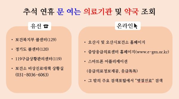 ÇÑÆí, Ãß¼® ¿¬ÈÞ ±â°£ ÀÌ¿ë °¡´ÉÇÑ ÀÇ·á±â°ü°ú ¾à±¹ Á¤º¸´Â ¡ã¿À»ê½Ã ¹× º¸°Ç¼Ò ȨÆäÀÌÁö ¡ãÁß¾ÓÀÀ±ÞÀÇ·á¼¾ÅÍ È¨ÆäÀÌÁö(www.e-gen.or.kr) ¡ã½º¸¶Æ®Æù ¾Û(ÀÀ±ÞÀÇ·áÁ¤º¸Á¦°ø, ÀÀ±Þ¶È¶È) ¡ãº¸°Çº¹ÁöºÎ Äݼ¾ÅÍ(129) ¡ã°æ±âµµ Äݼ¾ÅÍ(120) ¡ã119±¸±Þ»óȲ°ü¸®¼¾ÅÍ µîÀ» ÅëÇØ ½±°í Æí¸®ÇÏ°Ô È®ÀÎÇÒ ¼ö ÀÖ´Ù.