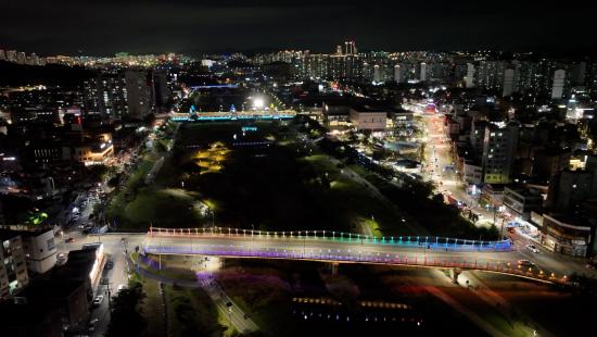 À̳¯ ¿À»êÀÇ ¿ª»ç¿Í ¹Ì·¡ µµ½ÃÀÇ ºñÀüÀ» Ç¥ÇöÇϱâ À§ÇØ 600´ëÀÇ µå·ÐÀÌ ºûÀ» ³Â°í, ³²ÃÌ´ë±³¿Í ¿À»ê´ë±³, Àº°è´ë±³¸¦ µ¿½Ã¿¡ ¹àÈ÷´Â °æ°ü Á¶¸íÀÌ Á¡µîµÇ¸ç ½Ã¹ÎµéÀÇ ´«±æÀ» »ç·ÎÀâ¾Ò½À´Ï´Ù.