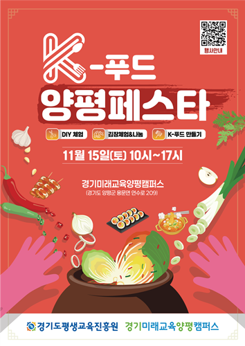 °æ±âµµÆò»ý±³À°ÁøÈï¿ø °æ±â¹Ì·¡±³À°¾çÆòÄ·ÆÛ½º°¡ ¿À´Â 15ÀÏ ¡®À½½ÄÀ¸·Î ¹è¿ì°í ³ª´©´Â Æò»ýÇнÀ¡¯À» ÁÖÁ¦·Î Çѱ¹ÀÇ À½½Ä¹®È¿Í ÀüÅëÀ» üÇèÇÒ ¼ö ÀÖ´Â ¡®K-Ǫµå ¾çÆòÆä½ºÅ¸¡¯¸¦ °³ÃÖÇÑ´Ù.¾çÆòÆä½ºÅ¸´Â ¿ÃÇØ 9~10¿ù±îÁö ÃÑ 4¹øÀÌ ¿·ÈÀ¸¸ç ¾à 4,600¸íÀÌ Âü¿©Çϸç Å« È£ÀÀÀ» ¾ò¾ú´Ù. 11¿ù Çà»ç´Â ¿ÃÇØ ´Ù¼¸ ¹øÂ° ¾çÆòÆä½ºÅ¸·Î KǪµå¸¦ ÁÖÁ¦·Î ÁøÇàµÈ´Ù.