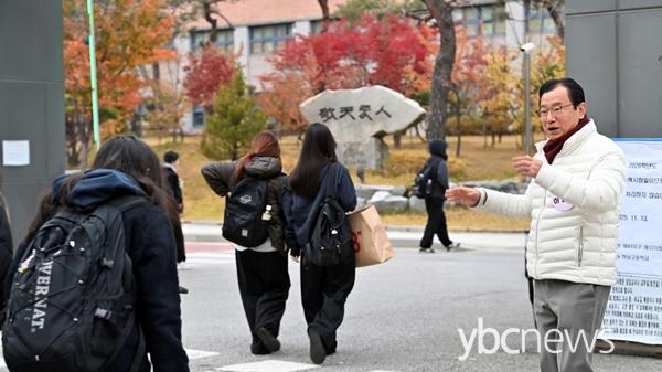 ÀÌ ½ÃÀåÀº Ãß¿î ³¯¾¾ ¼Ó¿¡¼­µµ ½ÃÇèÀå ¾ÕÀ» ÁöŰ´Â Çкθð¿Í ±³Á÷¿øµé¿¡°Ô °¨»ç Àλ縦 ÀüÇϸç, ±³¹®À» Åë°úÇÏ´Â ¼öÇè»ýµé¿¡°Ô ¡°±×µ¿¾È È기 ¶¡ÀÇ °á½ÇÀÌ ºûÀ» ¹ßÇÏ´Â ³¯¡±À̶ó¸ç ¡°Çϳ²½Ã´Â ¿©·¯ºÐµéÀÌ ¿À·ÔÀÌ ½ÃÇè¿¡ ÁýÁßÇÒ ¼ö ÀÖµµ·Ï ³¡±îÁö ÇÔ²² Çϰڴ١±°í °Ý·ÁÀÇ ¸»À» °Ç³Þ´Ù.