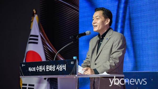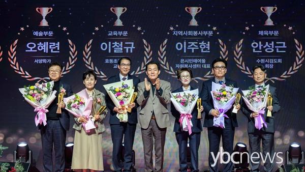 ¼ö»óÀڵ鿡°Ô Æ®·ÎÇǸ¦ ¼ö¿©ÇÑ ÀÌÀçÁØ ¼ö¿ø½ÃÀåÀº ¡°¼ö»óÀÇ ¿µ¿¹¸¦ ¾ÈÀ¸½Å ºÐµéÀº ¼ö¿ø½ÃÀÇ ¹®È¡¤¿¹¼ú¡¤Ã¼À° µîÀÇ ¹ßÀüÀ» À§ÇØ Çå½ÅÇϽŠºÐµé¡±À̶ó¸ç ¡°À̵éÀÇ Çå½Å°ú ¿Á¤Àº ¼ö¿øÀÇ ÀںνÉÀÌÀÚ ½Ã¹Î ¸ðµÎ°¡ ÇÔ²² ³ª´ À¯»ê¡±À̶ó°í ¸»Çß´Ù.