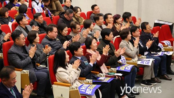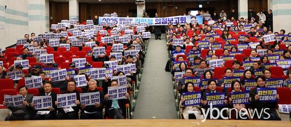 ÀÌ¾î ±èº´ÁÖ¡¤À̾ðÁÖ ÃÖ°íÀ§¿ø°ú ±è³²±Ù¡¤¹®±ÝÁÖ¡¤¹®Áø¼®¡¤¹Ú»óÇõ¡¤¹é½Â¾Æ¡¤À±Á¾±º¡¤À̱âÇ塤Ç㿵 ÀÇ¿ø µî ¿ø³»´ëÇ¥´ÜÀ» Æ÷ÇÔÇØ, ±ÇÇ⿱¡¤±è¹®¼ö¡¤¹®´ë¸²¡¤¹Ú¿ë°©¡¤À̰ÇÅ¡¤À̼ºÀ±¡¤ÀÌ¿ë¿ì¡¤ÀüÁø¼÷¡¤Á¶ÀÎö ¿ø³»ºÎ´ëÇ¥´Ü, ±è¿ë Àü ¹ÎÁÖ¿¬±¸¿ø ºÎÀ§¿øÀå µî ¼ö¸¹Àº µ¿·á ÀÇ¿øµéÀÌ ¿µ»óÀ» ÅëÇØ ±è ÀÇ¿øÀÇ ÀÇÁ¤º¸°íȸ¸¦ ÀÀ¿øÇß´Ù.