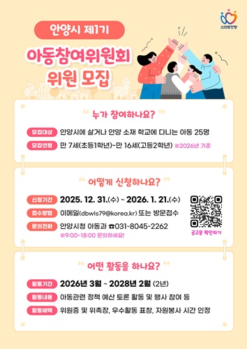 ¾Æµ¿Âü¿©À§¿øÀº 2026³â 3¿ùºÎÅÍ 2³â µ¿¾È ¡ã¾Æµ¿ °ü·Ã Á¤Ã¥ ¹× ¿¹»ê¿¡ ´ëÇÑ Åä·Ð ¡ã¾Æµ¿±Ç¸® ¿ËÈ£¡¤È«º¸ Ȱµ¿ ¡ã¾Æµ¿Ä£È °ø°£ üÇèȰµ¿ ¡ã¾Æµ¿ÇÐ´ë ¿¹¹æ Ä·ÆäÀÎ µî ½ÃÁ¤ÀÇ ÆÄÆ®³Ê·Î¼ ´Ù¾çÇÑ È°µ¿À» ¼öÇàÇÏ°Ô µÈ´Ù. ¾Æµ¿Âü¿©À§¿ø¿¡°Ô´Â ÀÚ¿øºÀ»ç ½ÇÀû ÀÎÁ¤, ǥâ ¼ö¿© µîÀÇ ÇýÅÃÀÌ ÁÖ¾îÁø´Ù.
