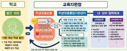¡®°æ±âÇü Çлý¸ÂÃãÅëÇÕÁö¿øÃ¼°è¡¯´Â Çб³°¡ º¹ÇÕÀû À§±â ÇлýÀ» ¹ß°ßÇÏ¸é ±³À°Áö¿øÃ»À¸·Î ÀÇ·ÚÇÏ°í ±³À°Áö¿øÃ» Çлý¸ÂÃãÅëÇÕÁö¿ø¼¾ÅÍ´Â ÀÇ·ÚÇÑ ³»¿ëÀ» ÅëÇÕÀûÀ¸·Î Áø´Ü¡¤Áö¿ø¡¤°ü¸®ÇÏ´Â ¹æ½ÄÀÌ´Ù. À̸¦ ÅëÇØ Çб³ÀÇ ¾÷¹« ºÎ´ãÀ» ÃÖ¼ÒÈÇϰí Çлýº° ¸ÂÃã ÅëÇÕÁö¿øÀ» ½ÇÇöÇÒ ¼ö ÀÖ´Ù.