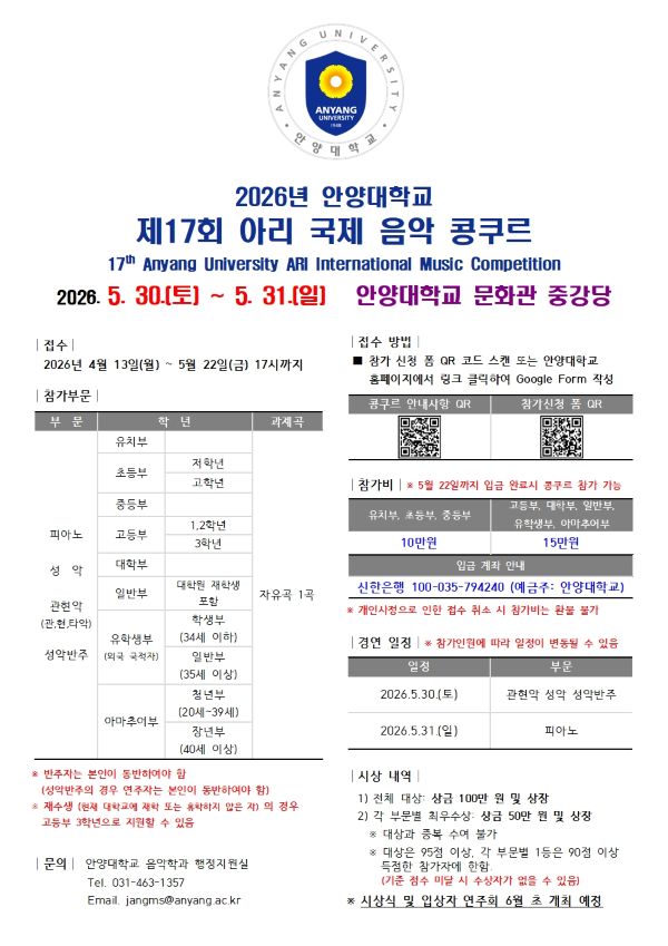 ¾È¾ç´ëÇб³(ÃÑÀå À層¼ö)´Â ±Û·Î¹ú À½¾Ç ÀÎÀç ¹ß±¼ ¹× À°¼ºÀ» À§ÇÑ ¡®2026 Á¦17ȸ ¾Æ¸® ±¹Á¦ À½¾Ç ÄáÄí¸£¡¯¸¦ ¿À´Â 5¿ù 30ÀÏ °³ÃÖÇÑ´Ù.