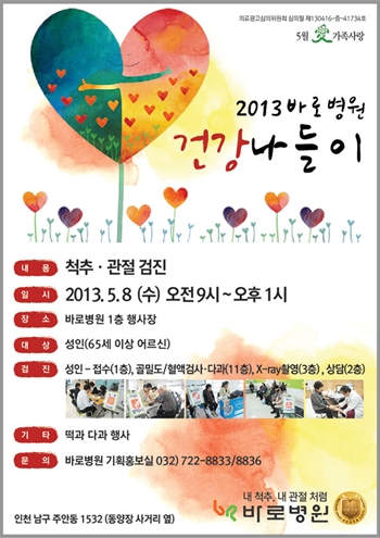 ¡®°Ç°³ªµéÀÌ¡¯ ³ª´®°ËÁø Çà»ç¿¡ ´ëÇÑ ÀÚ¼¼ÇÑ ¾È³» ¹× Âü°¡¹®ÀÇ´Â ÀÎõ ¹Ù·Îº´¿ø ±âȹȫº¸½Ç(032-722-8833)¿¡¼ È®ÀÎ °¡´ÉÇÏ´Ù.
