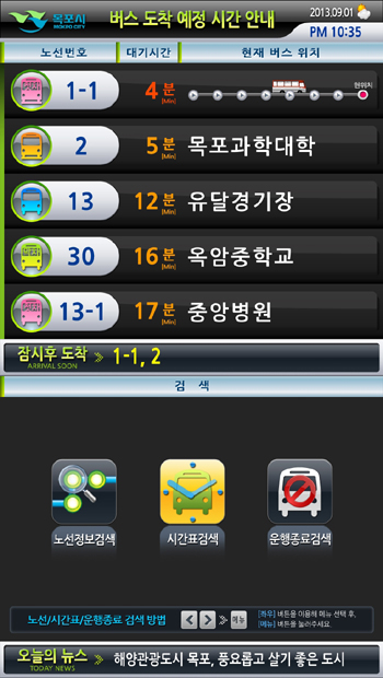 ÀÌ¿¡ µû¶ó ¿Ã 11¿ùºÎÅÍ´Â ¹ö½ºÁ¤º¸½Ã½ºÅÛ ±¸ÃàÀ¸·Î ¹ö½ºÁ¤·ù¼Ò¿¡ ¼³Ä¡µÈ ¾È³»±â¸¦ ÅëÇØ ¹ö½ºÀÇ Ãâ¹ß, µµÂø, ¹èÂ÷½Ã°£°ú ½Ç½Ã°£ ´º½º, ³¯¾¾, ÇöÀç½Ã°£ µîÀ» ¾Ë ¼ö ÀÖ°Ô µÈ´Ù.