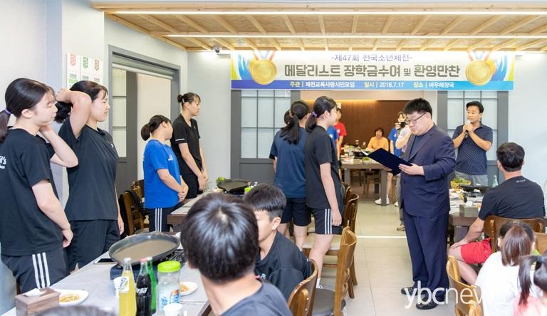 ÃæºÏ Á¦Ãµ±³À°»ç¶û½Ã¹Î¸ðÀÓ(ȸÀå ÀåÇѼº)Àº Áö³­ 17ÀÏ 6½Ã30ºÐ Á¦ÃµÀÇ ÇÑ ½Ä´ç¿¡¼­ Á¦47ȸ Àü±¹¼Ò³âüÀ°´ëȸ¿¡¼­ ÀÔ»óÇÑ ¼±¼ö¿Í ÁöµµÀÚ ±×¸®°í ÇØ´ç Çб³Àåµî 83¿©¸íÀ» ÃÊ´ëÇØ Á¦ÃµÀ» ºû³½ ¼±¼öµéÀ» °Ý·ÁÇÏ°í ¸¸ÂùÀ» º£Ç®¾ú´Ù.