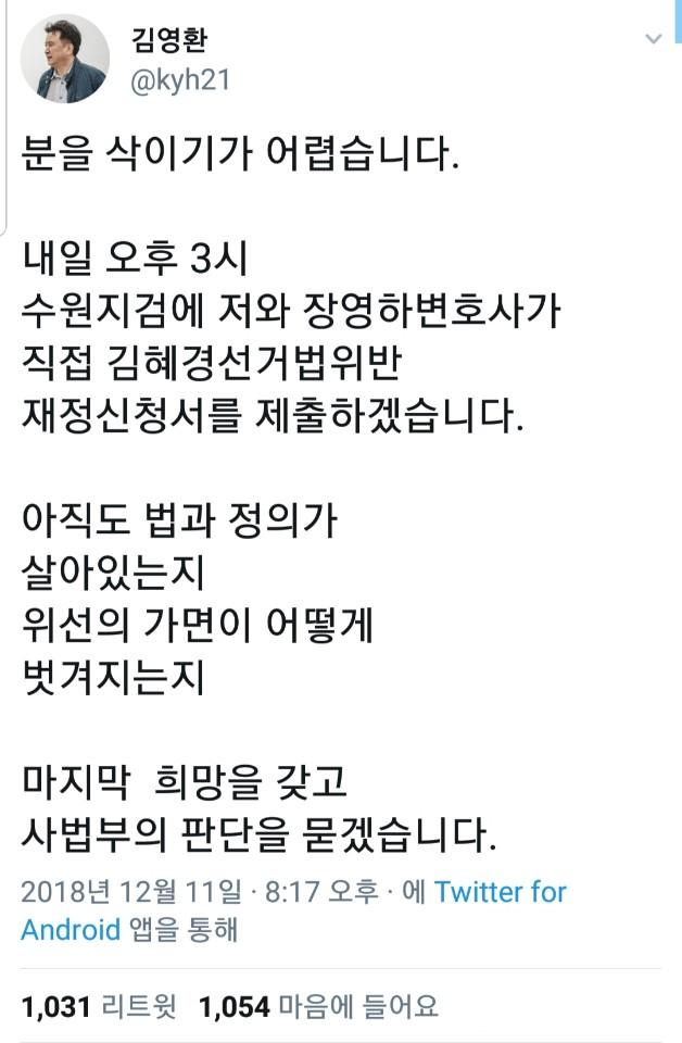 [Ãâó-±è¿µÈ¯ Àü °æ±âµµÁö»ç Èĺ¸ Æ®À§ÅÍ]±èÇý°æ¾¾ ºÒ±â¼ÒóºÐ¿¡ ¹Ý¹ß, ÀçÁ¤½ÅûÀ» û±¸ÇÒ °ÍÀ̶ó°í ¹àÈù ±è¿µÈ¯ Àü Èĺ¸